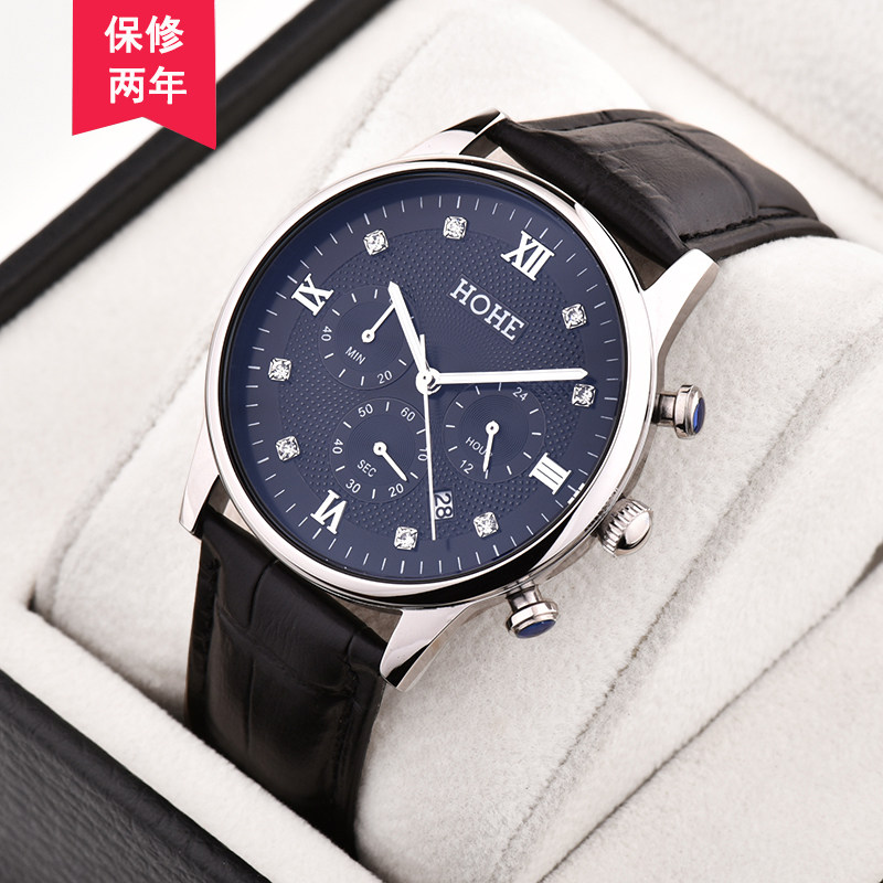 正品HOHE手表 男士时尚休闲皮带防水石英表 夜光潮流韩版日历男表