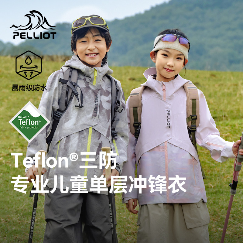 伯希和户外儿童单层冲锋衣男童女童2025新款特氟龙三防登山服外套