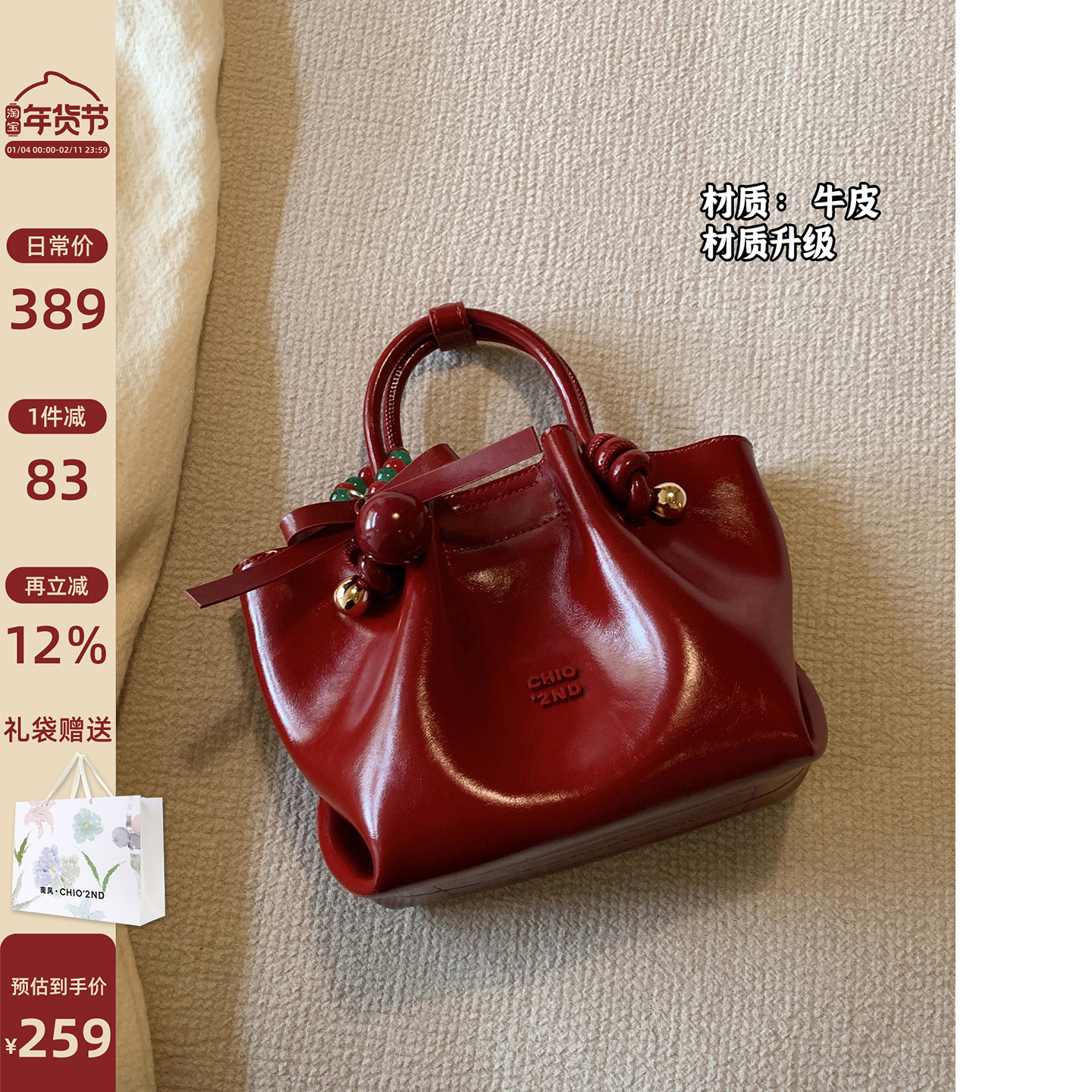 南风Chio2nd 微醺波尔多真皮牛皮枕头包女手提红色婚包单肩斜挎包