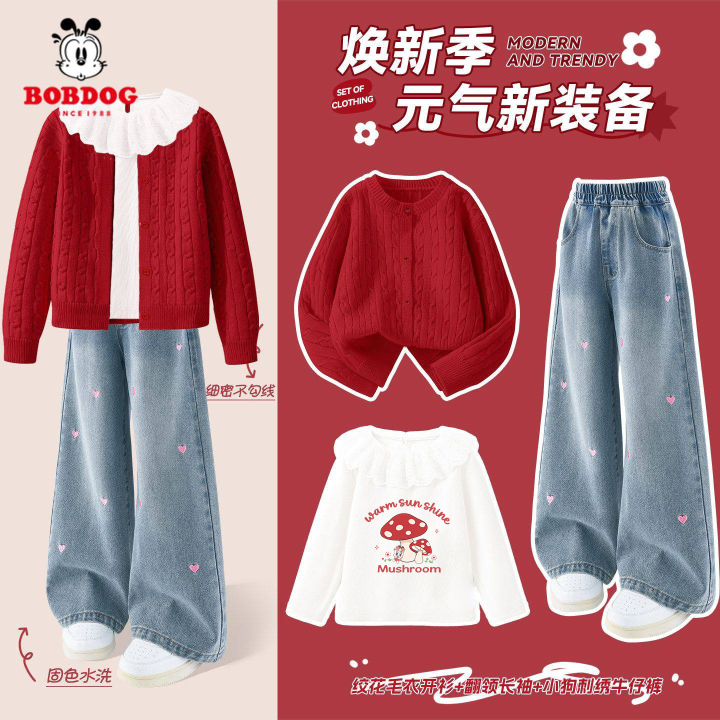 巴布豆女童春款套装2026新款洋气时髦儿童毛衣针织衫牛仔裤三件套