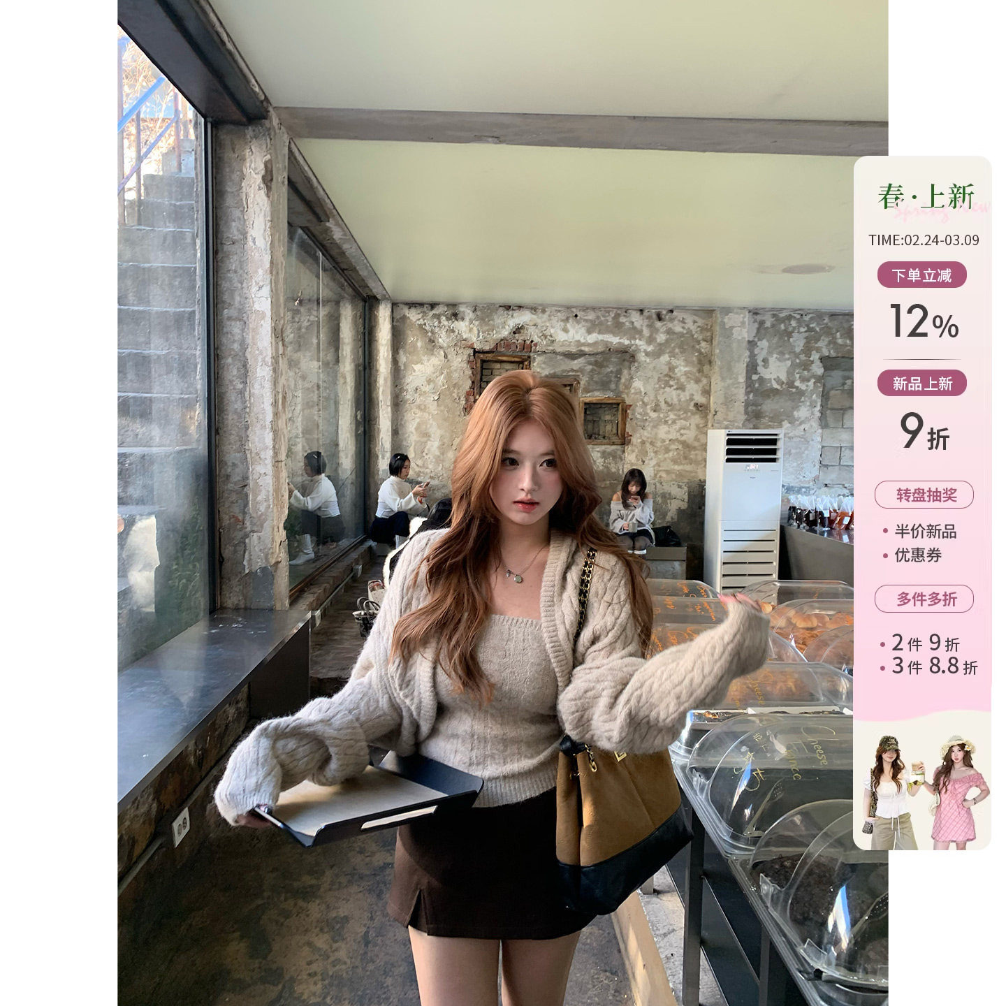 你的鱼 加州落日 韩系微胖mm复古轻熟感春款粗麻花针织开衫套装
