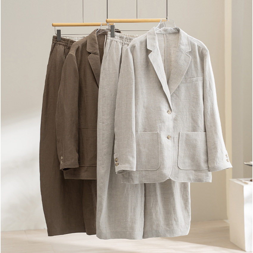 亚麻西装套装两件套透气宽松上衣松紧阔腿裤弯刀裤女2026春款套装