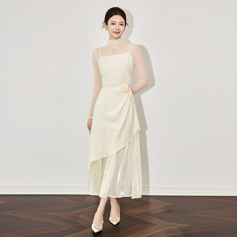 2502102-南油时尚设计感花朵网纱不规则吊带长款连衣裙女春款套装