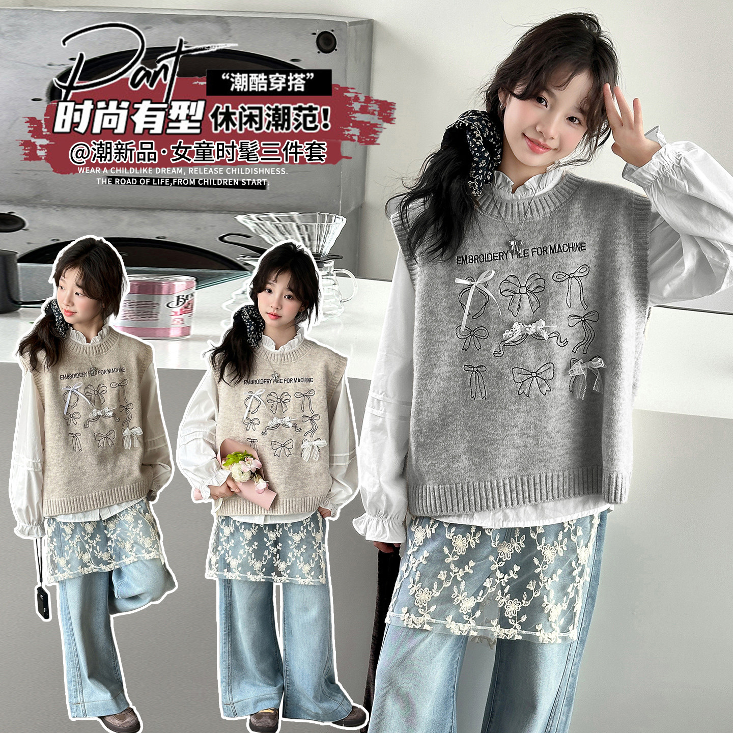 女童2026春季新款时尚洋气刺绣衬衫马甲牛仔裤三件套儿童春款套装