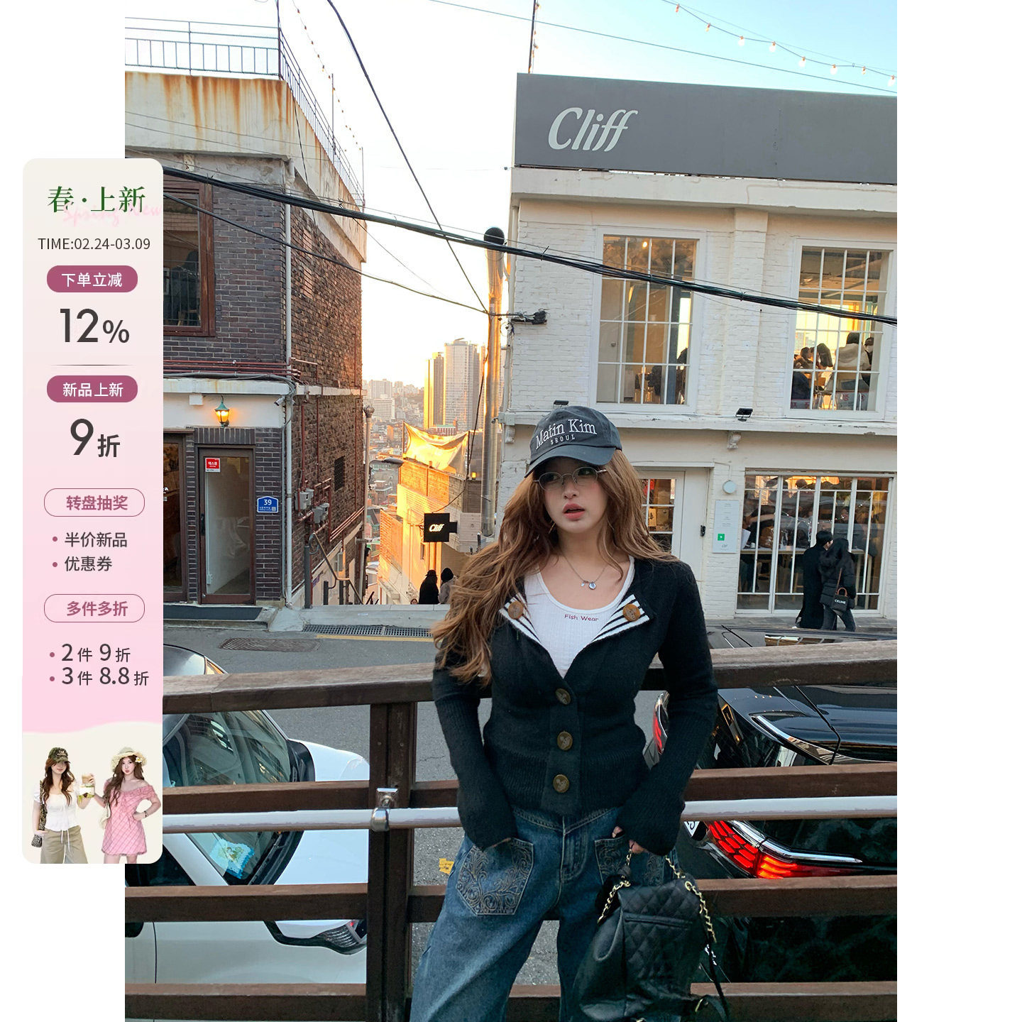 你的鱼 风栖甜栗 韩系微胖mm春款复古设计感翻领纽扣毛织开衫套装