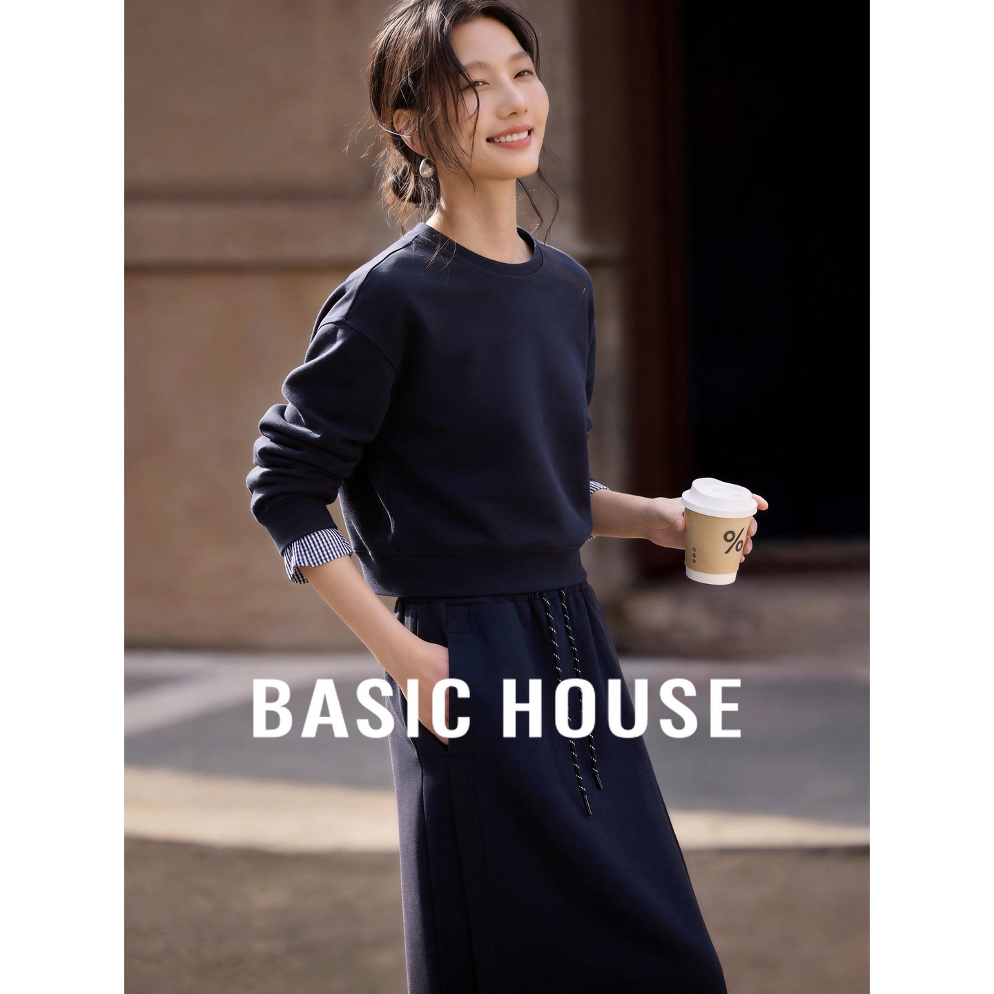 Basic House/百家好格纹袖口拼接卫衣抽绳松紧纯色半身裙春款套装