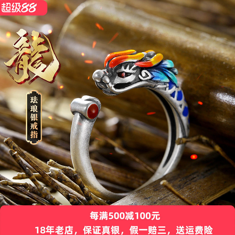 990纯银珐琅龙戒指男女士款复古轻奢小众男生食指开口可调节指环