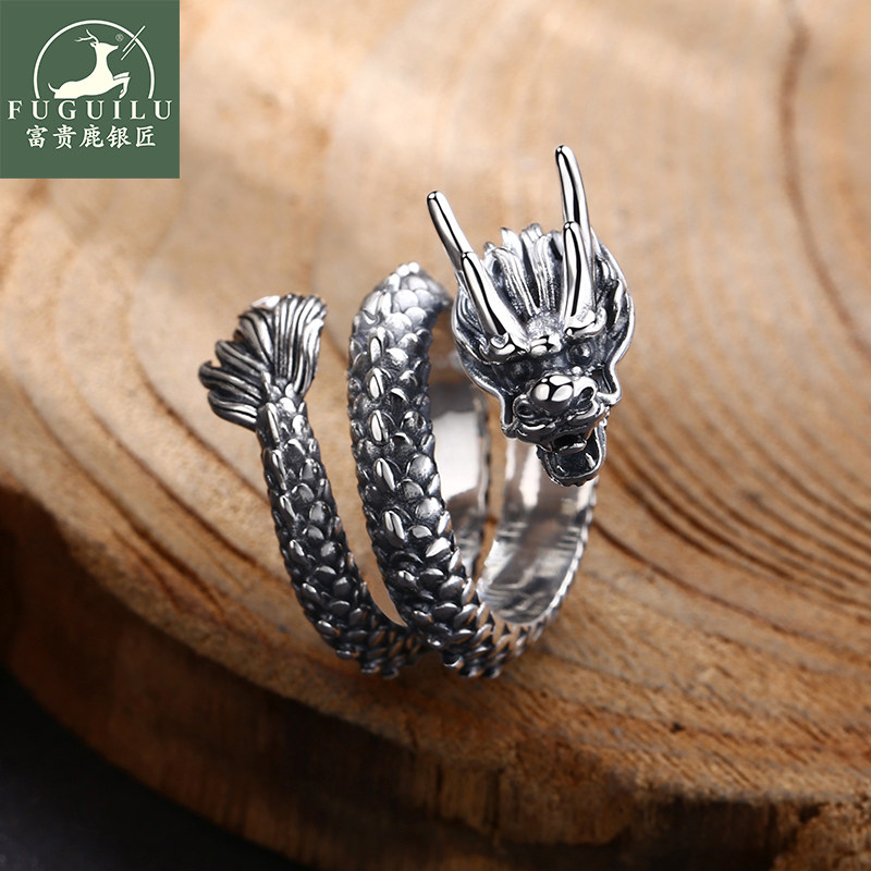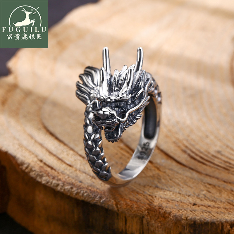 富贵鹿s925银男士戒指民族风国潮龙年立体龙戒指复古龙头指环戒