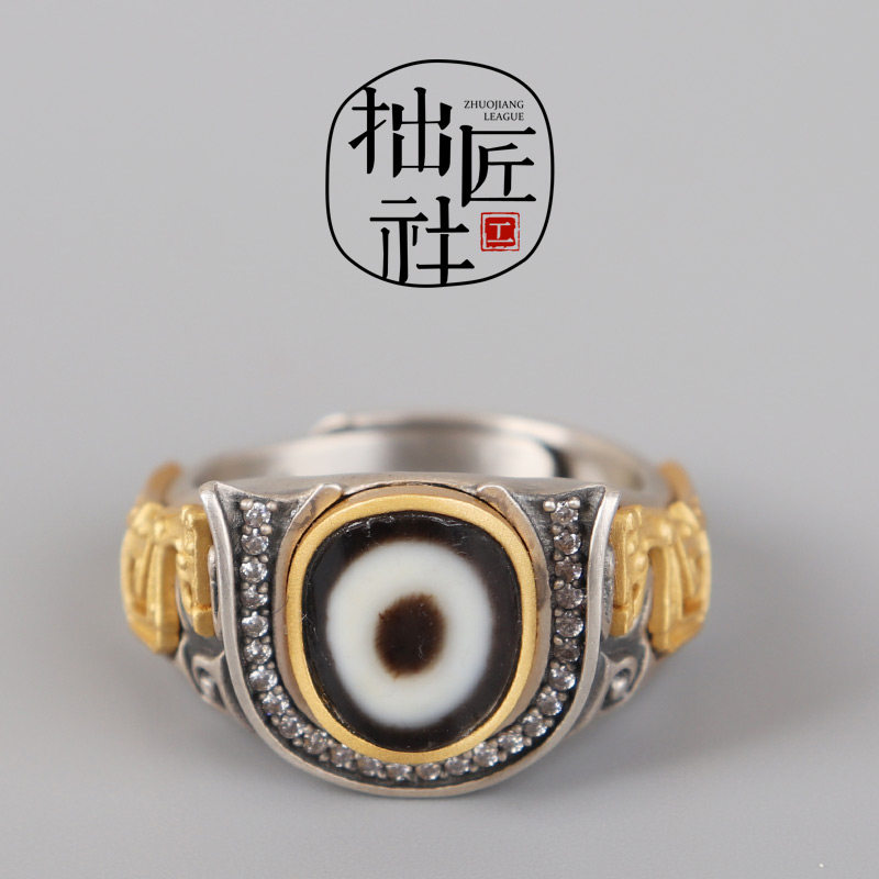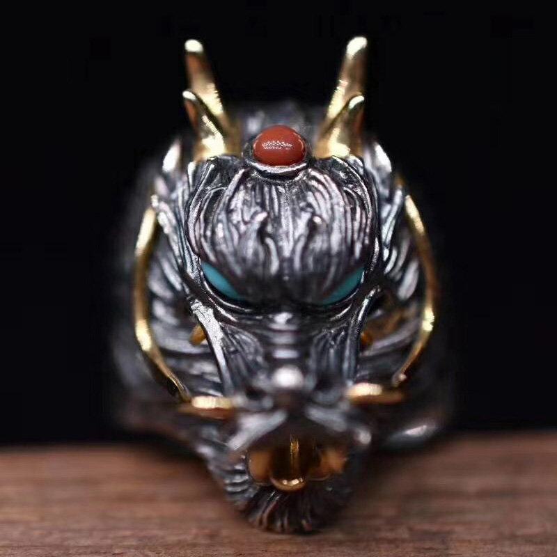 手工应龙戒指男S925纯银镶嵌松石南红霸气国风复古活口食指戒卓耿