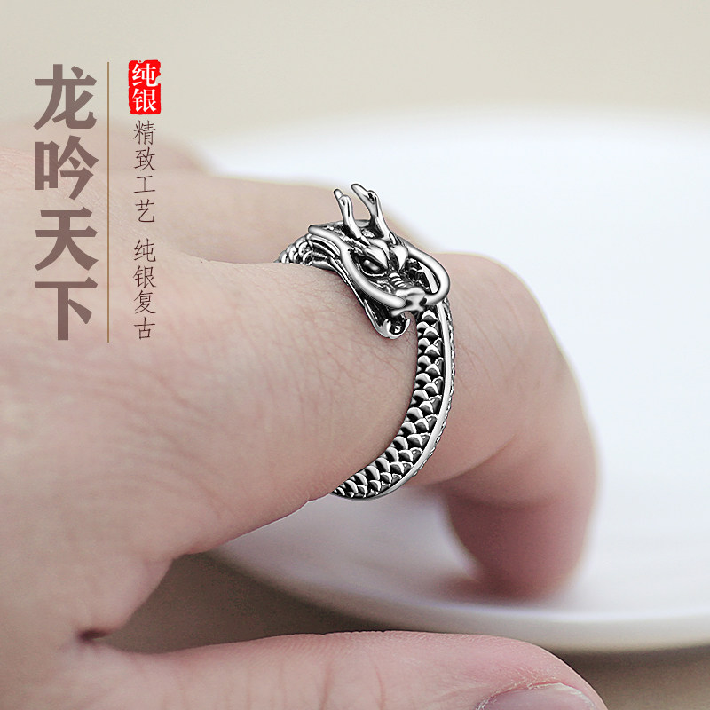 足银999龙戒指男款守护指环复古龙头戒立体手雕龙纹介子霸气饰品