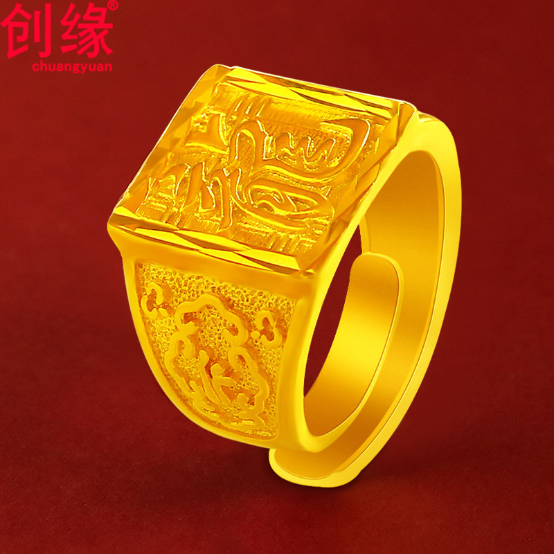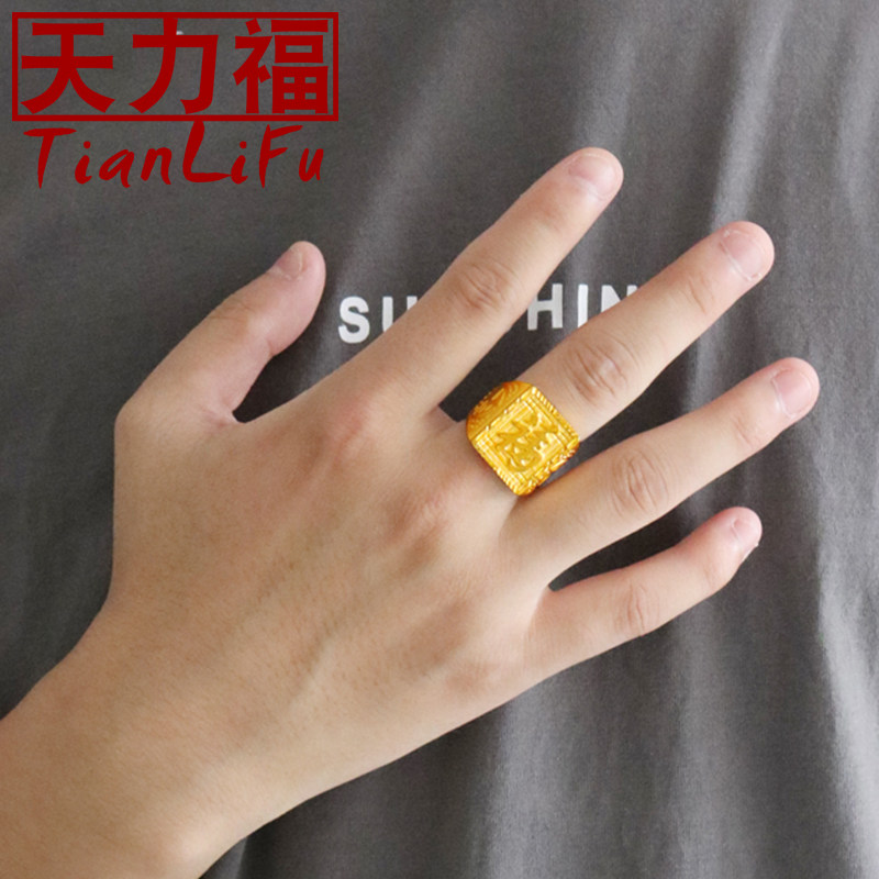 沙金戒指男发财福字仿真金戒指开口磨砂999心经指环宽方龙戒道具