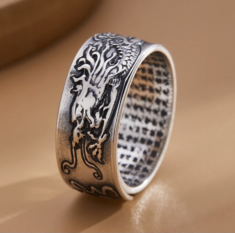 入梦S999足纯银龙戒指复古装民族风浮雕心经开口男款指环七夕礼品
