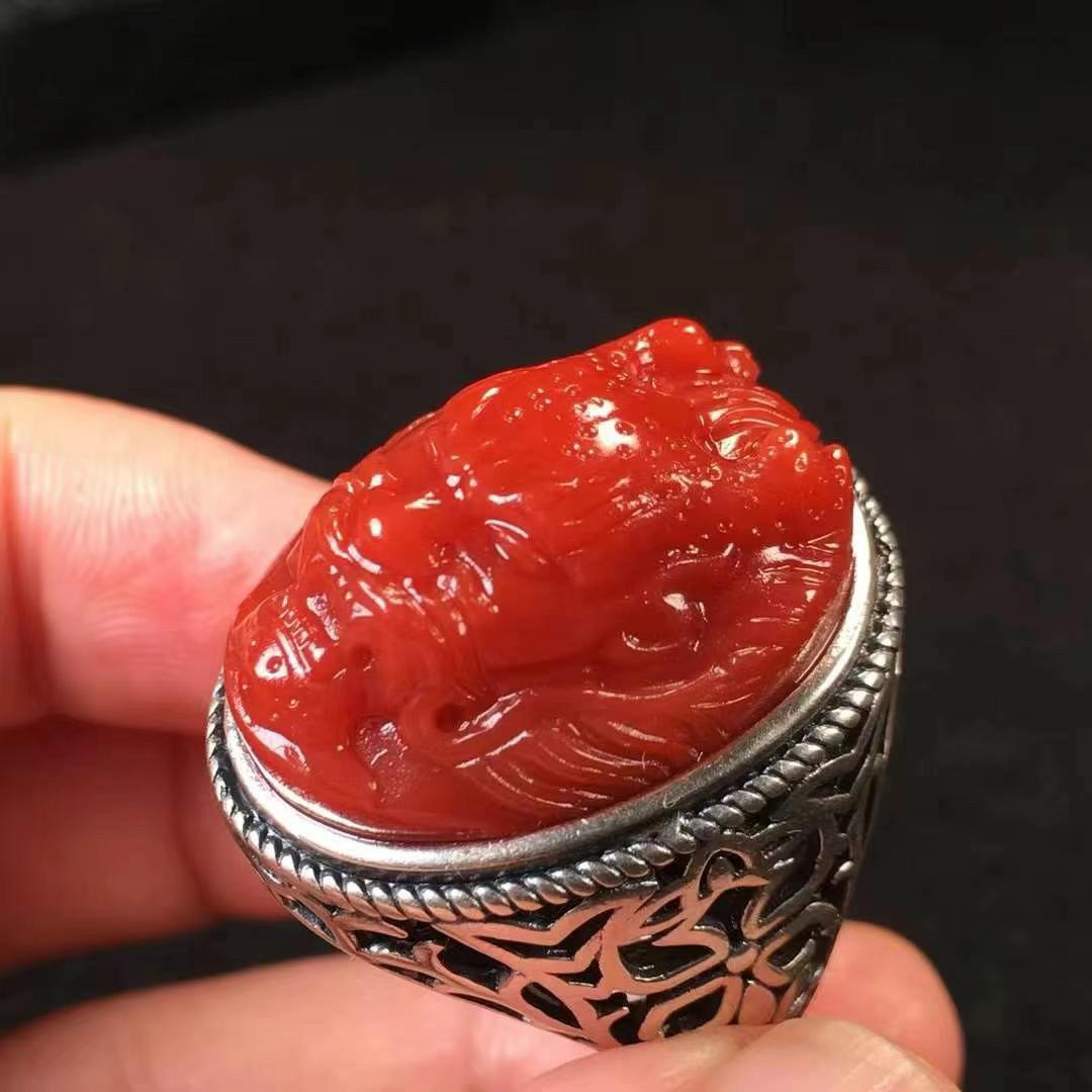 纯银青龙戒指手雕版龙戒指男款霸气龙戒复古个性指环镶嵌美松南红