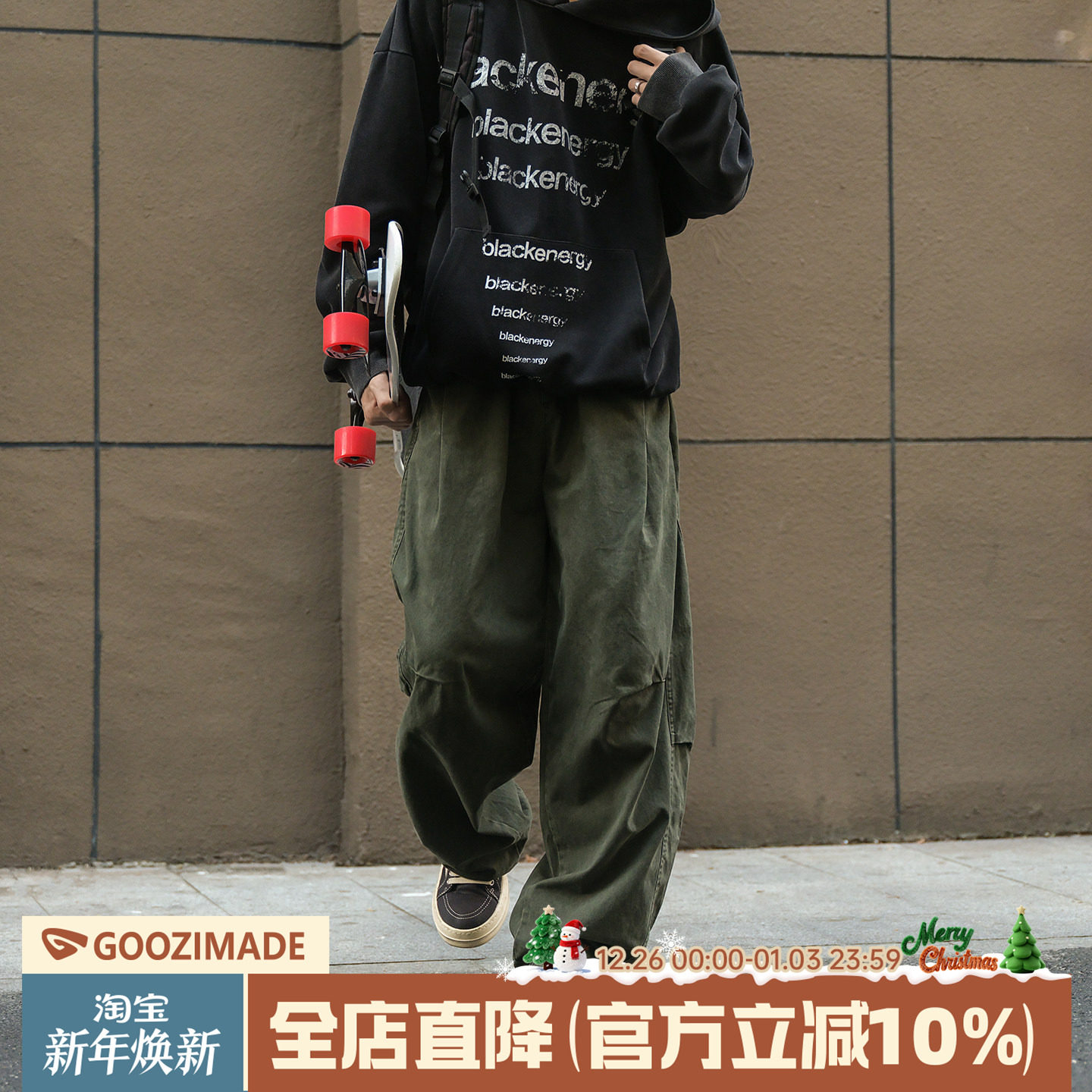 港仔文艺男军绿色工装裤男秋冬宽松直筒裤子男生阔腿休闲长裤男款