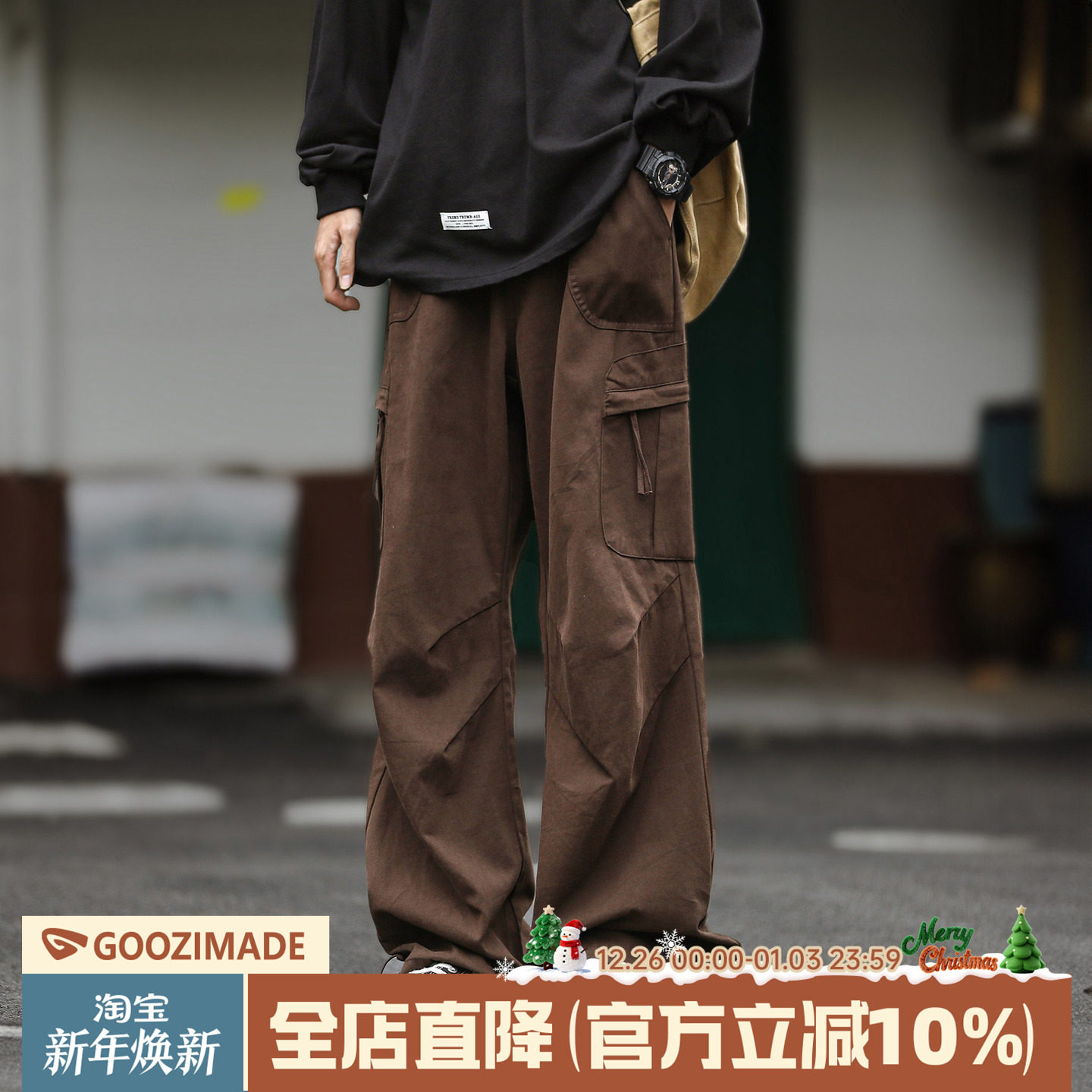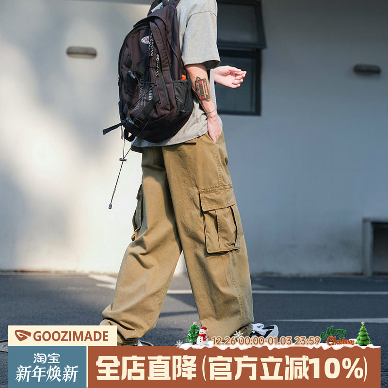 @港仔文艺男 卡其色工装裤男秋冬日系阔腿裤子男生冬休闲长裤男款