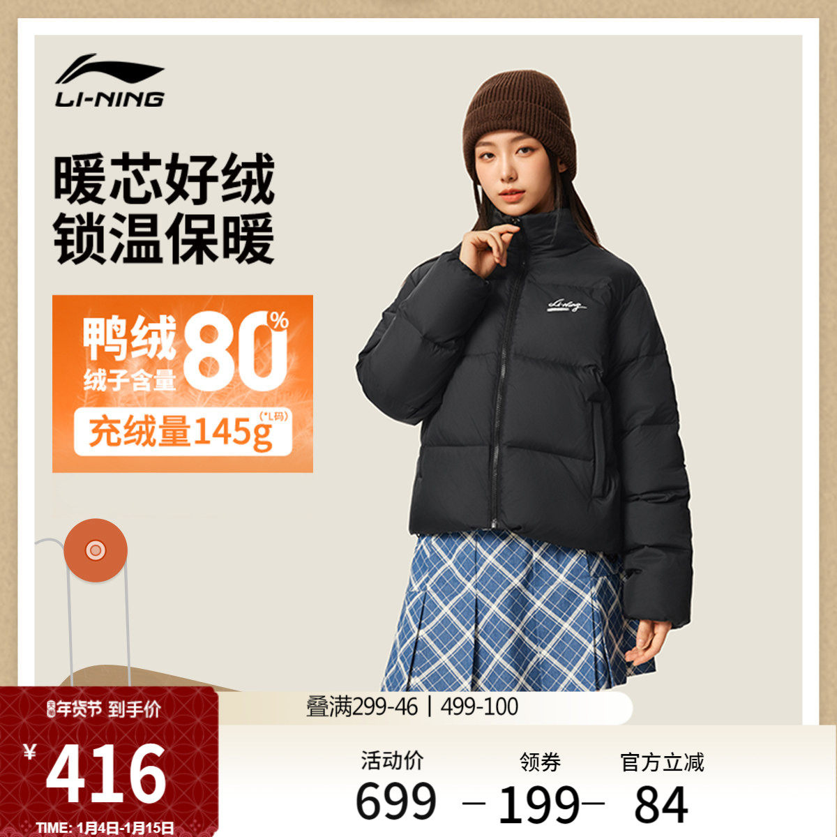 李宁短款羽绒服女士官方新款运动潮流系列冬季鸭绒立领外套运动服