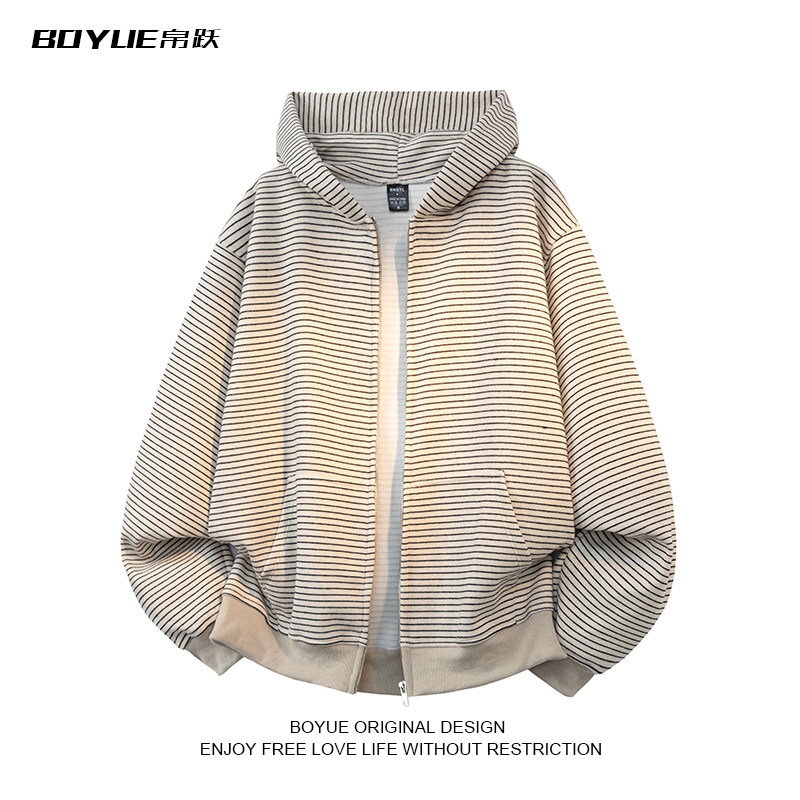 BOYUE帛跃日系条纹连帽卫衣休闲复古重磅慵懒风青春运动外套男女