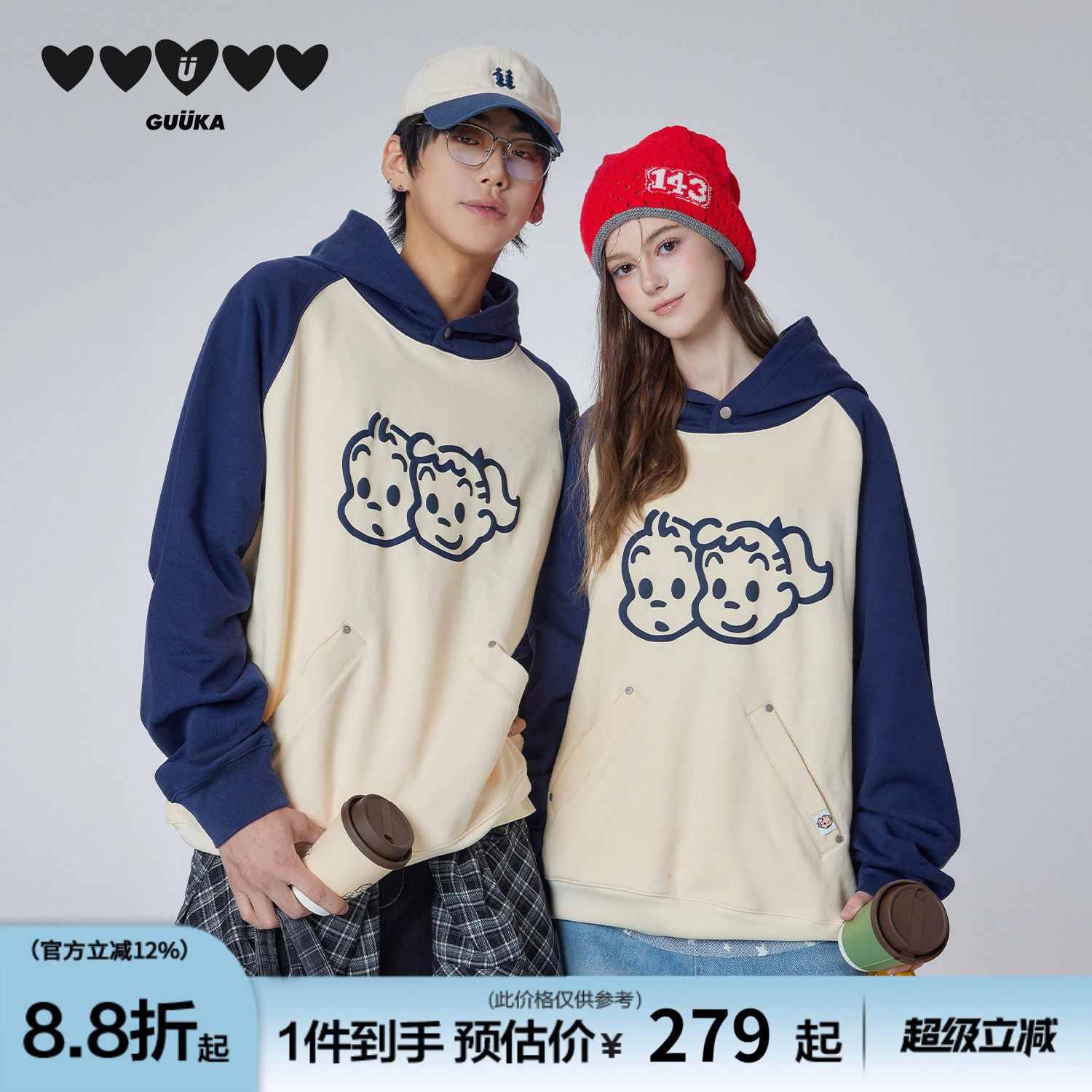 GUUKA&原田治联名重磅纯棉连帽卫衣男日系插肩袖帽衫撞色拼接上衣