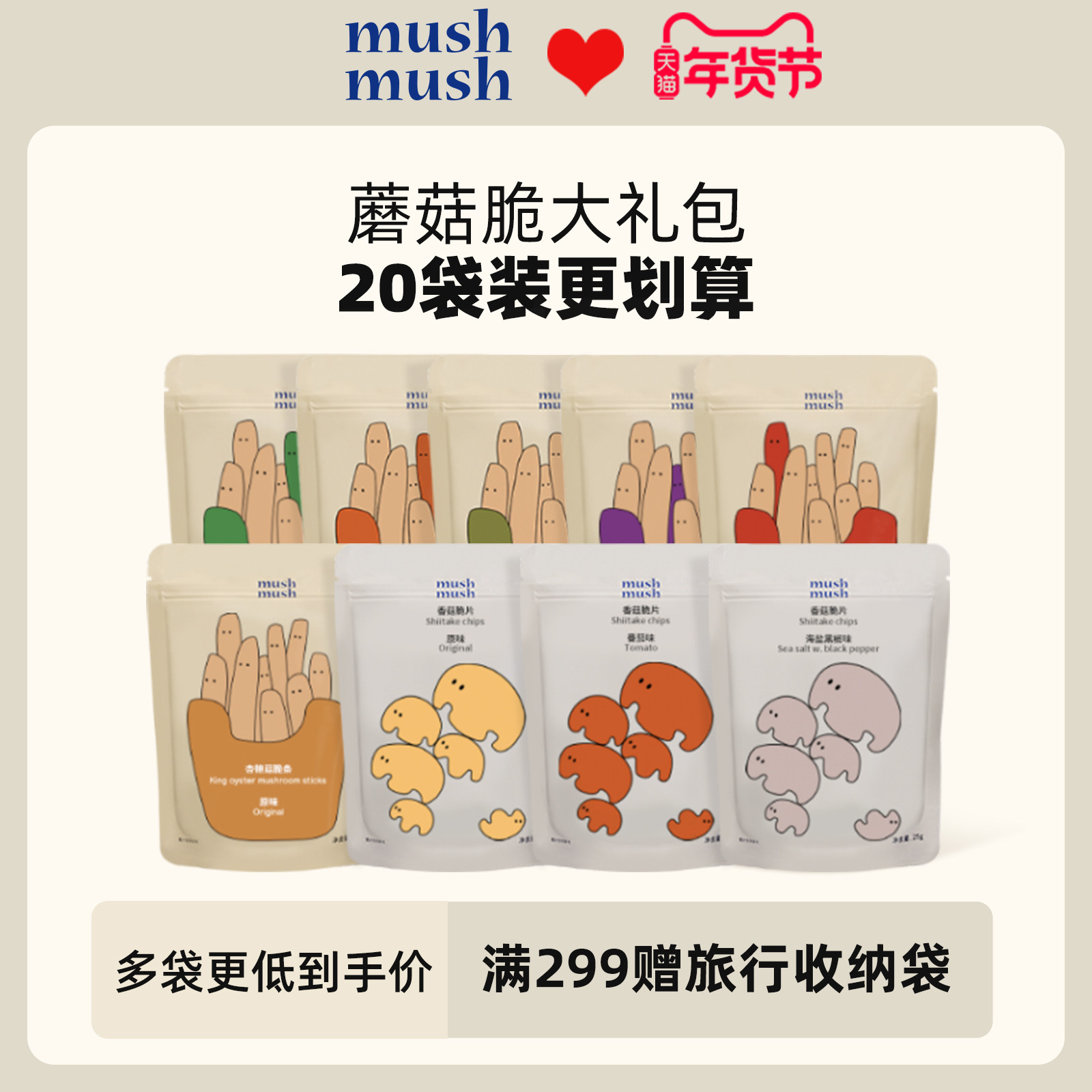 mushmush香菇脆片杏鲍菇脆条20袋混合年货礼包蘑菇零食