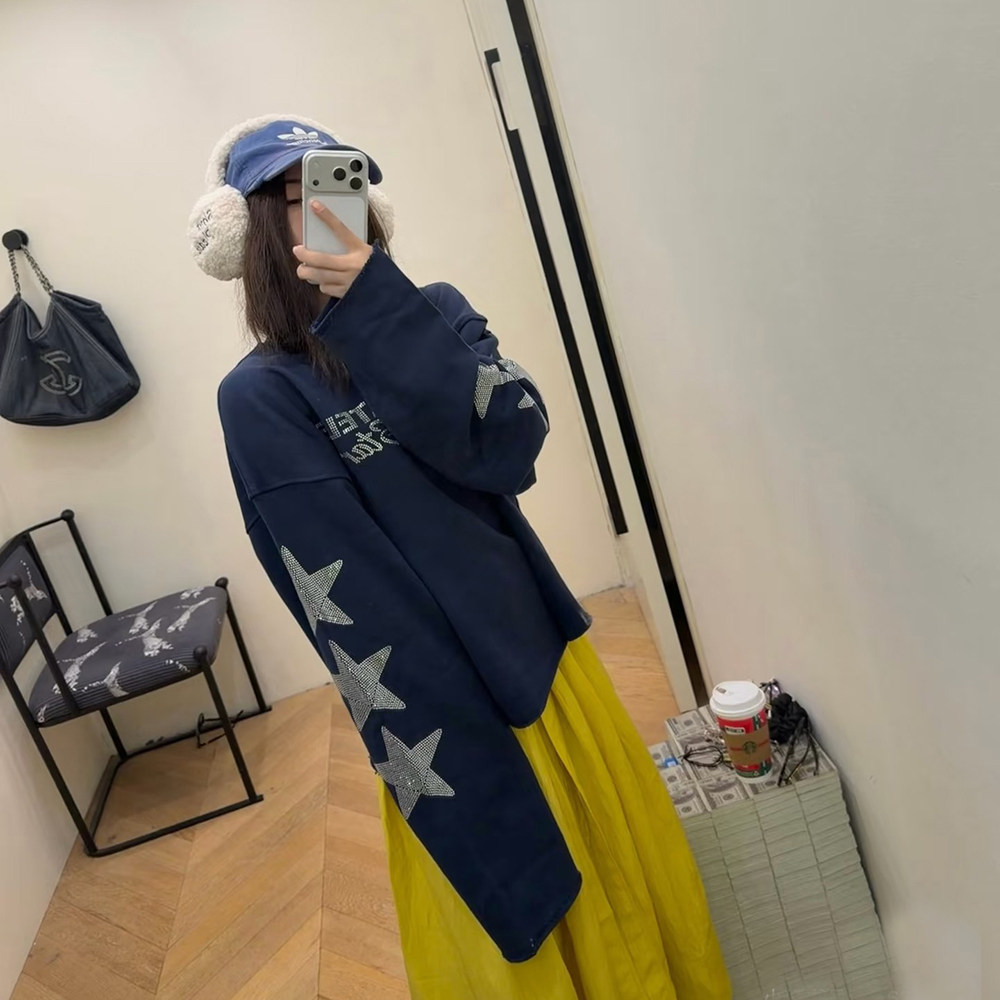 欧美风100%纯棉潮牌圆领卫衣春秋薄款美式宽松oversize黑色上衣女