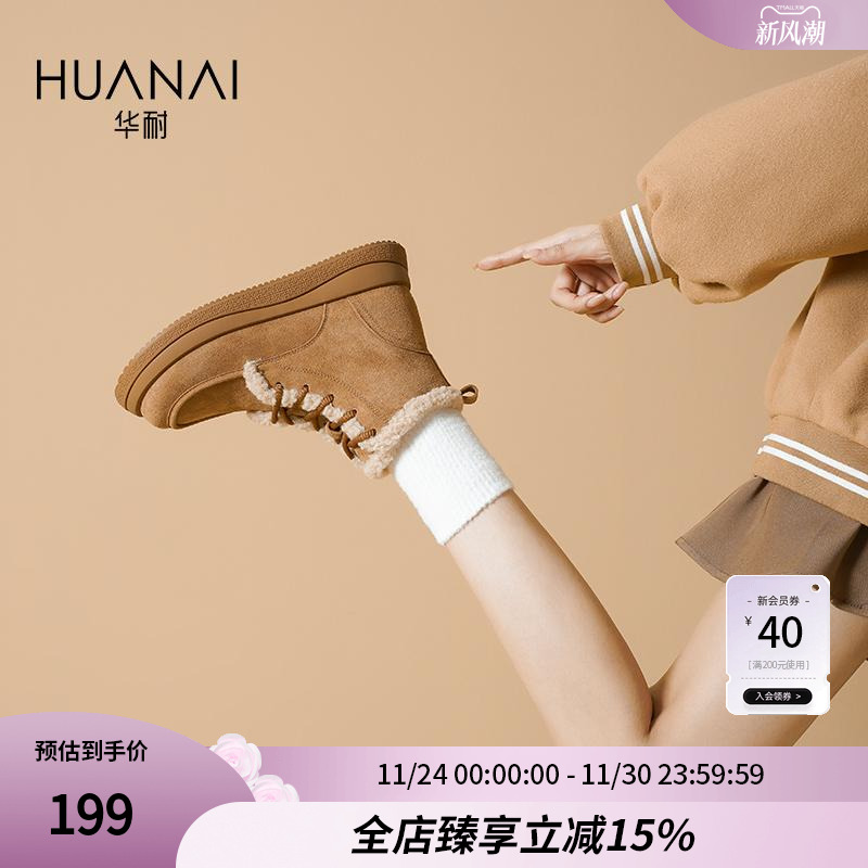 华耐高帮勃肯女鞋秋冬2025款加绒马丁靴羊羔毛系带雪地靴厚底棉鞋