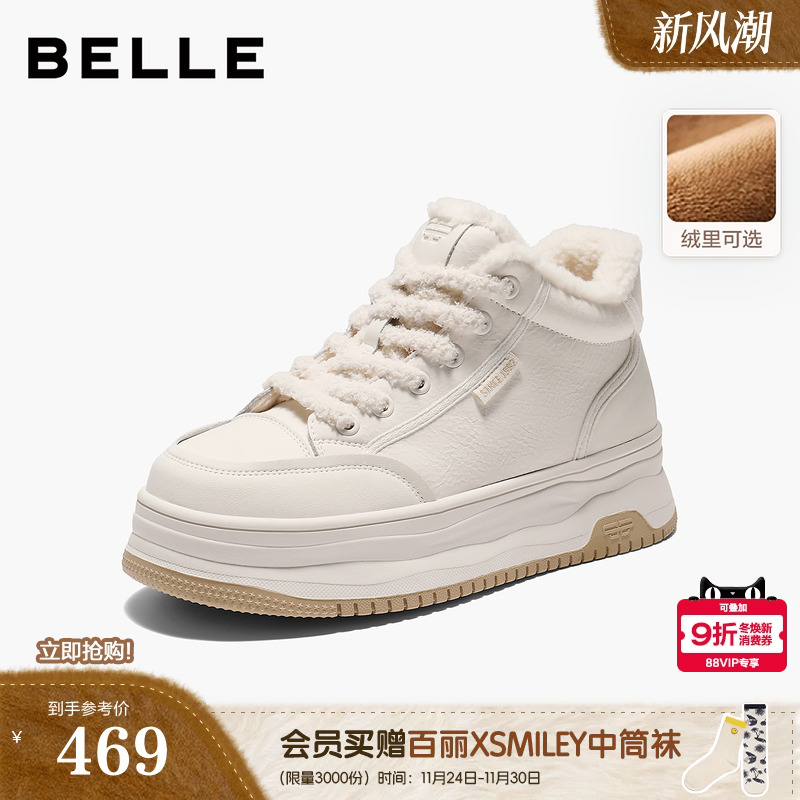 百丽女鞋子厚底高帮加绒板鞋女冬新棉鞋休闲运动小白鞋D4S1DDM4