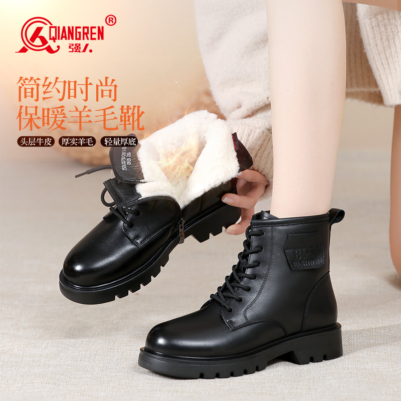 强人3515女靴冬季保暖羊毛靴时尚马丁靴真皮潮流英伦短靴高帮棉鞋