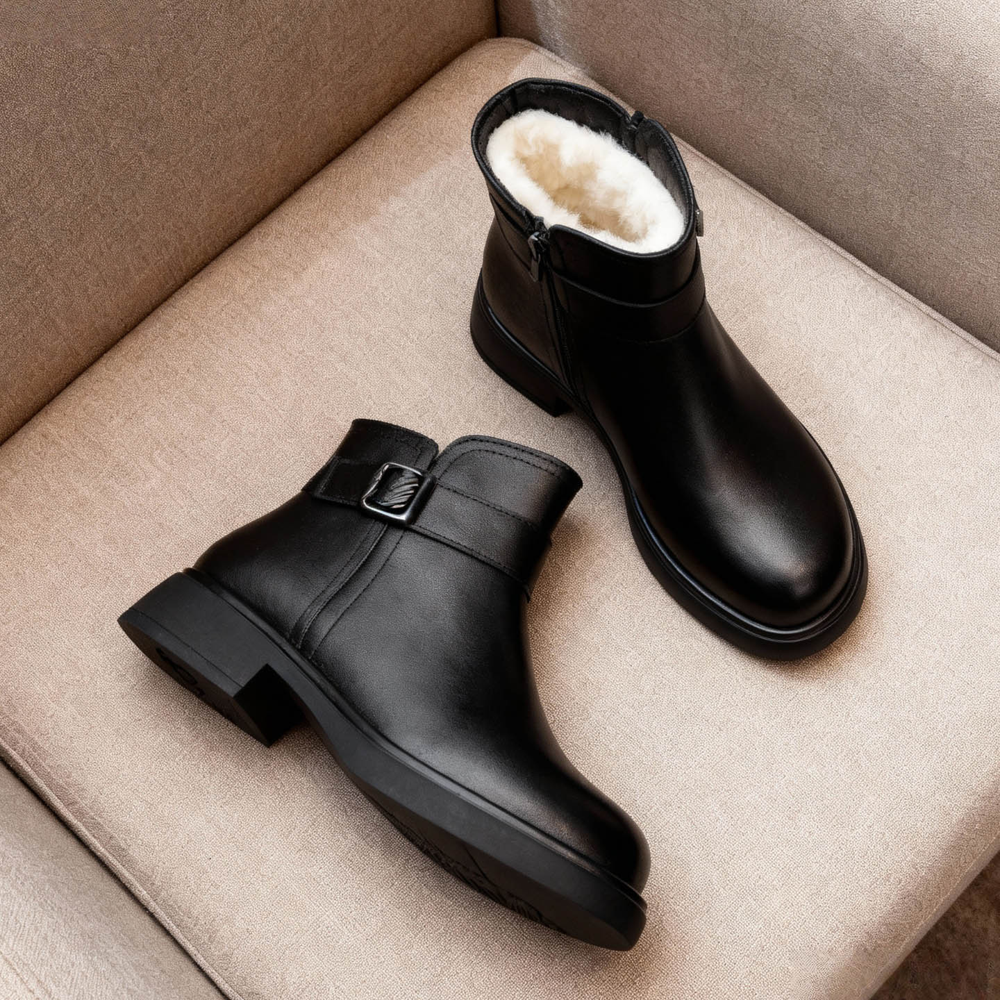 2025冬季平底短靴女真皮保暖羊毛一体雪地靴粗跟厚底马丁靴女靴子