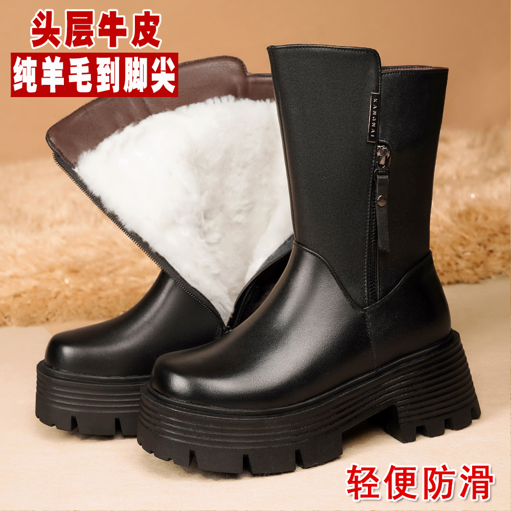 真皮厚底马丁靴女中筒靴新款女靴皮毛一体靴子女鞋加厚羊毛雪地靴