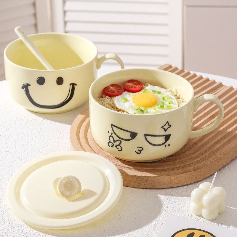陶瓷泡面碗带盖勺子可爱笑脸表情搞怪微波炉拉面碗学生宿舍专用碗