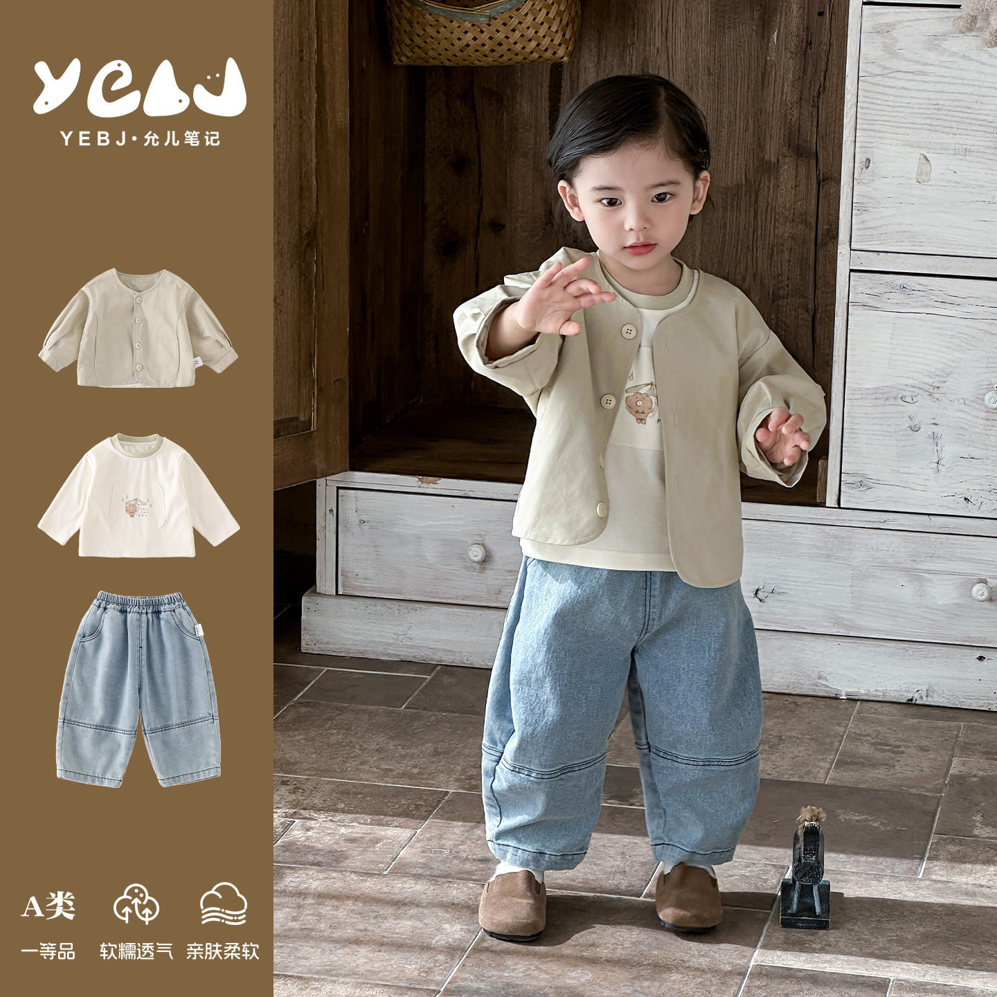 韩版春新品三件套开衫外套米色打底衫牛仔阔腿裤装男宝宝春季套装