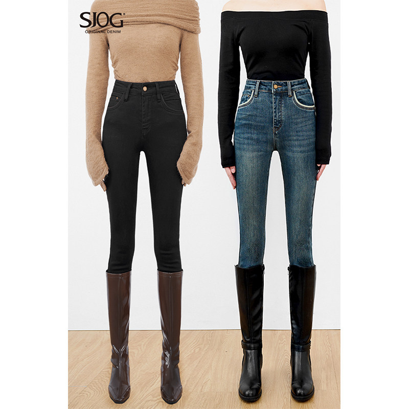 SJOG双色靴裤~加绒提臀蓝色牛仔裤女九分显瘦秋冬紧身小脚铅笔裤