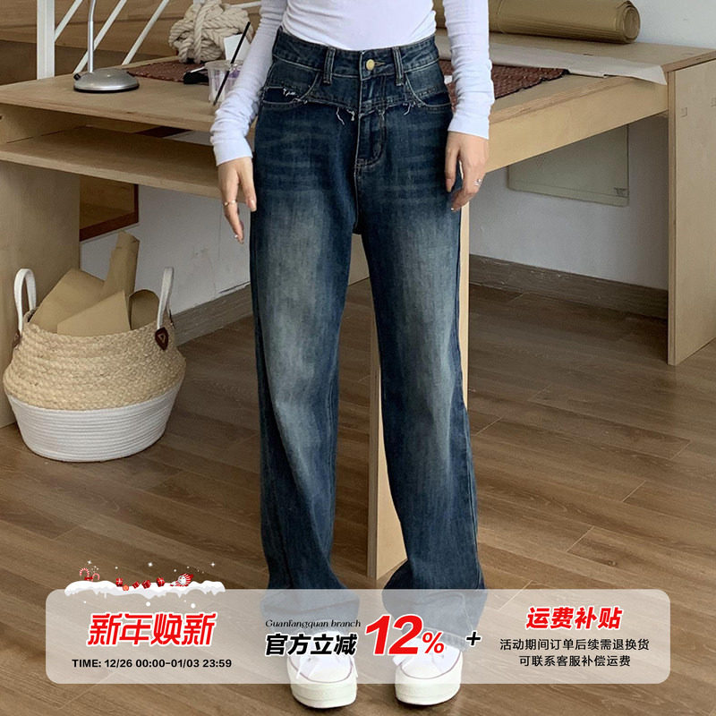 MULVAN 深蓝色牛仔裤女秋季复古高腰宽松显瘦休闲百搭直筒阔腿裤