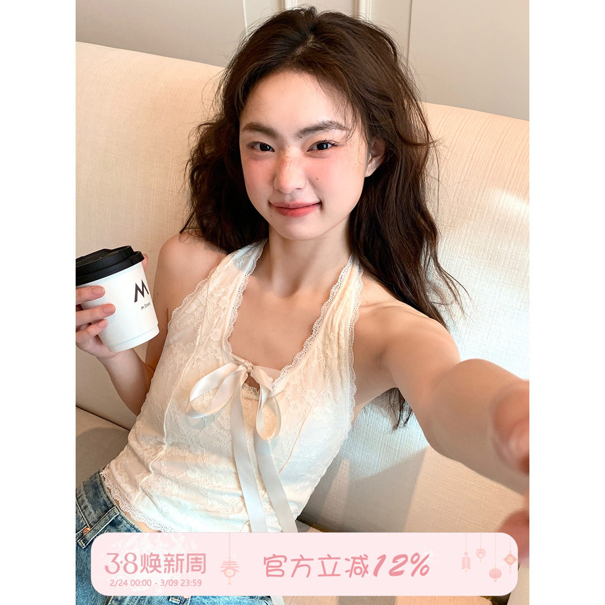 馨帮帮Bra纯欲V领挂脖吊带背心女带胸垫一体显瘦内搭系带蕾丝上衣