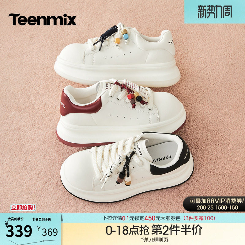 天美意串珠厚底增高面包小白鞋红色运动板鞋女鞋子秋季新款休闲鞋