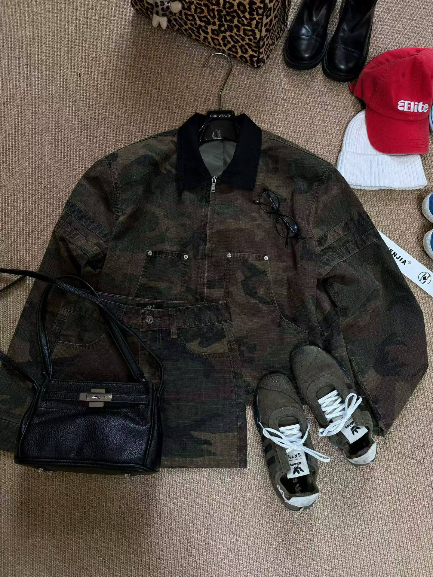GOD财神2026早春新款美式复古迷彩牛仔外套女+迷彩半裙套装
