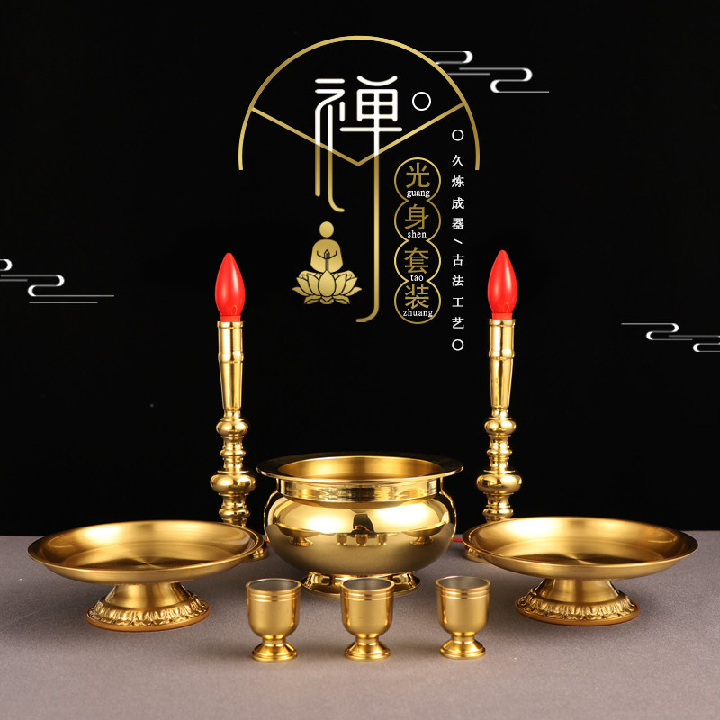 纯铜佛具套装家用全套供佛用品财神爷佛前香炉供水杯供盘花瓶供灯