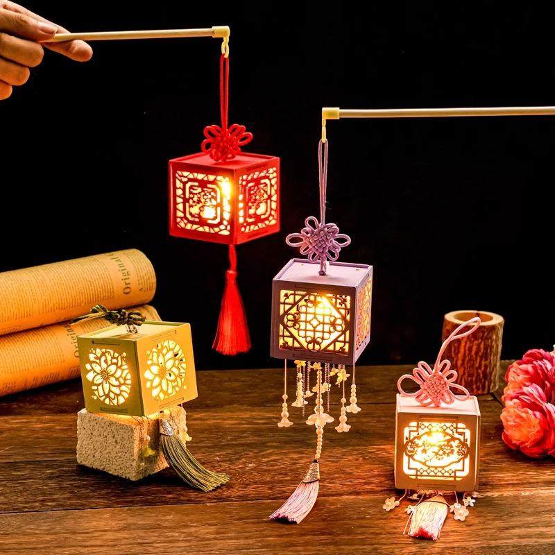 中秋灯笼挂饰中式古风木质宫灯小夜灯diy材料手提LED发光花窗灯笼