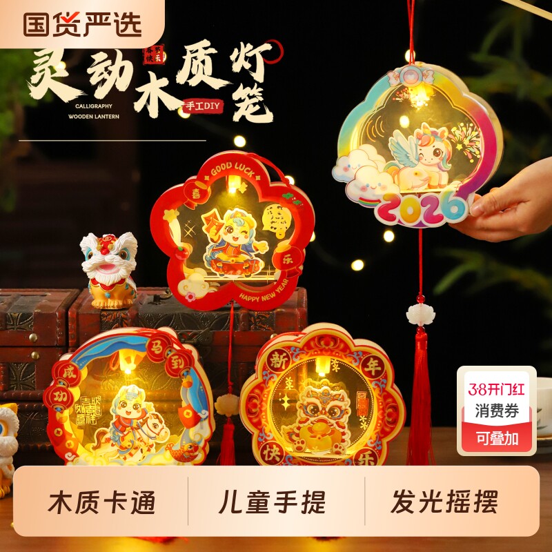 元宵节木质手提摇头灯笼2026马年发光新年儿童手工diy材料包花灯