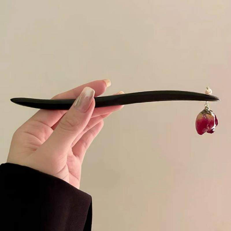 新中式干枯玫瑰黑木质发簪盘发簪子仙气质温柔古风发钗子发饰头饰