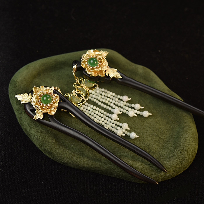 DURIAN ACC原创设计 新国风古风仿点翠牡丹花双齿发簪盘发簪子