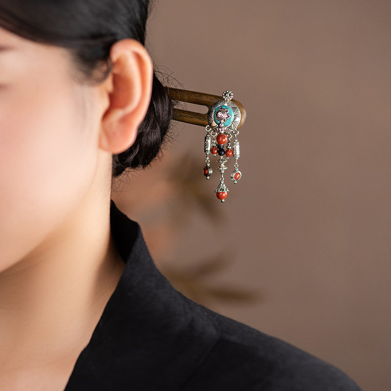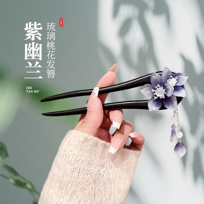 新中式莲花流苏檀木发簪女高级感发钗后脑勺盘发簪子汉服头饰双面
