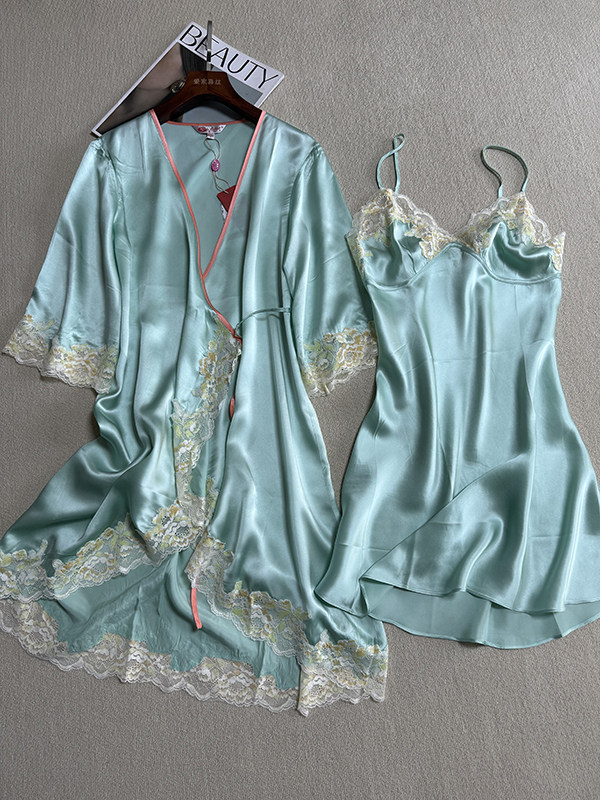 尾货100%真丝睡裙套装女桑蚕丝吊带浴袍两件套家居服丝绸性感睡裙