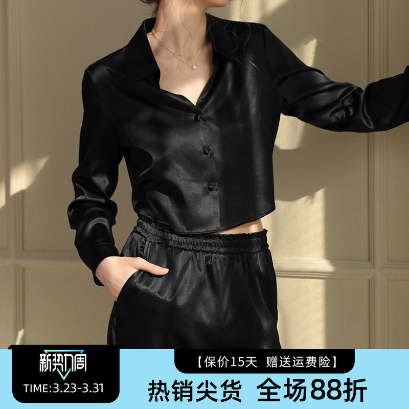 真丝睡衣睡裤两件套女桑蚕丝短款上衣长袖长裤家居服宽松丝绸套装
