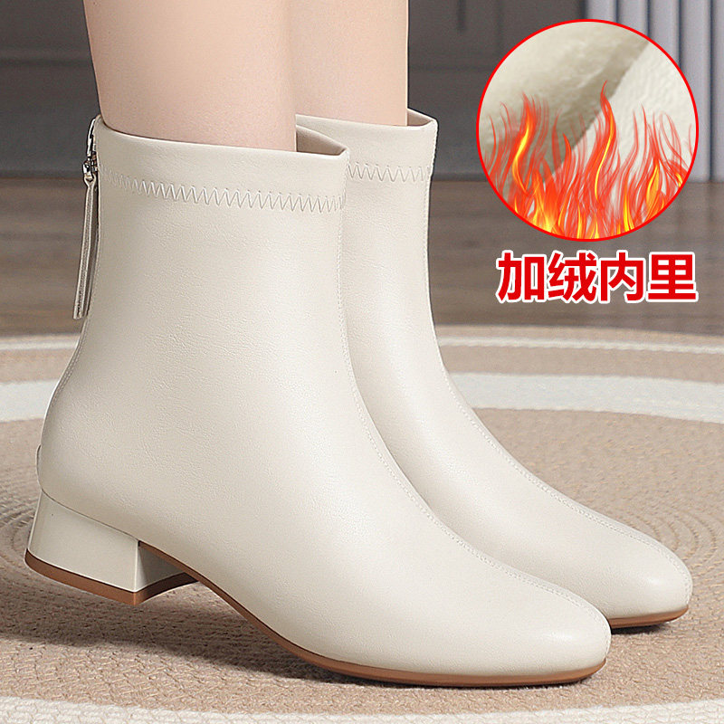 软皮中跟米色小短靴女2024新款春秋百搭马丁靴时尚方头粗跟瘦瘦靴