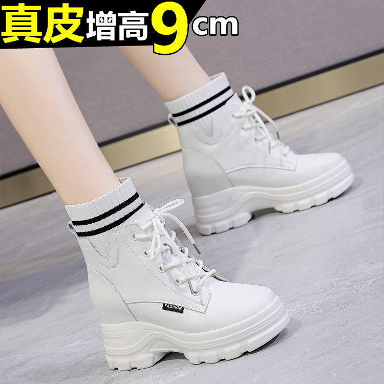 米色小短靴女秋款马丁靴内增高女鞋10cm高跟单靴厚底靴子真皮短靴