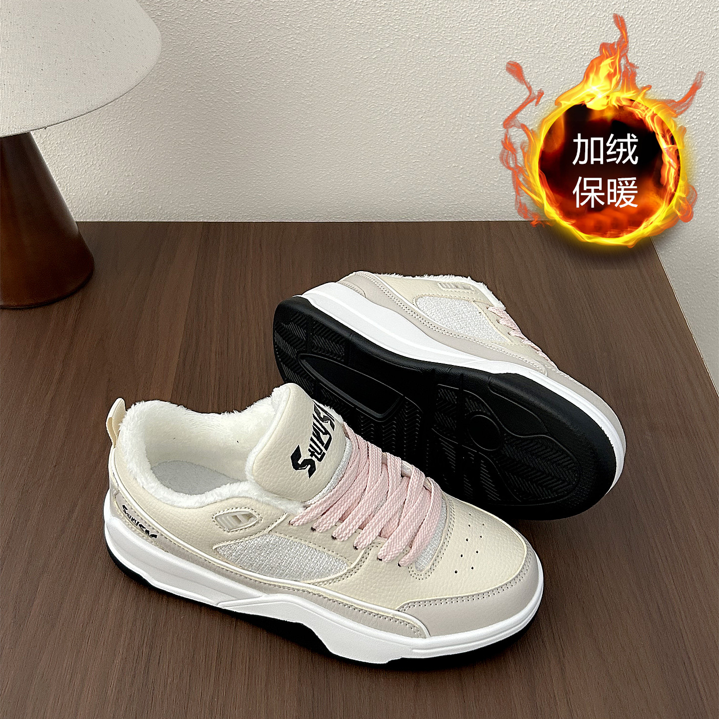 2025年冬季米色加绒保暖棉鞋女鞋ins潮轻便休闲运动鞋百搭板鞋