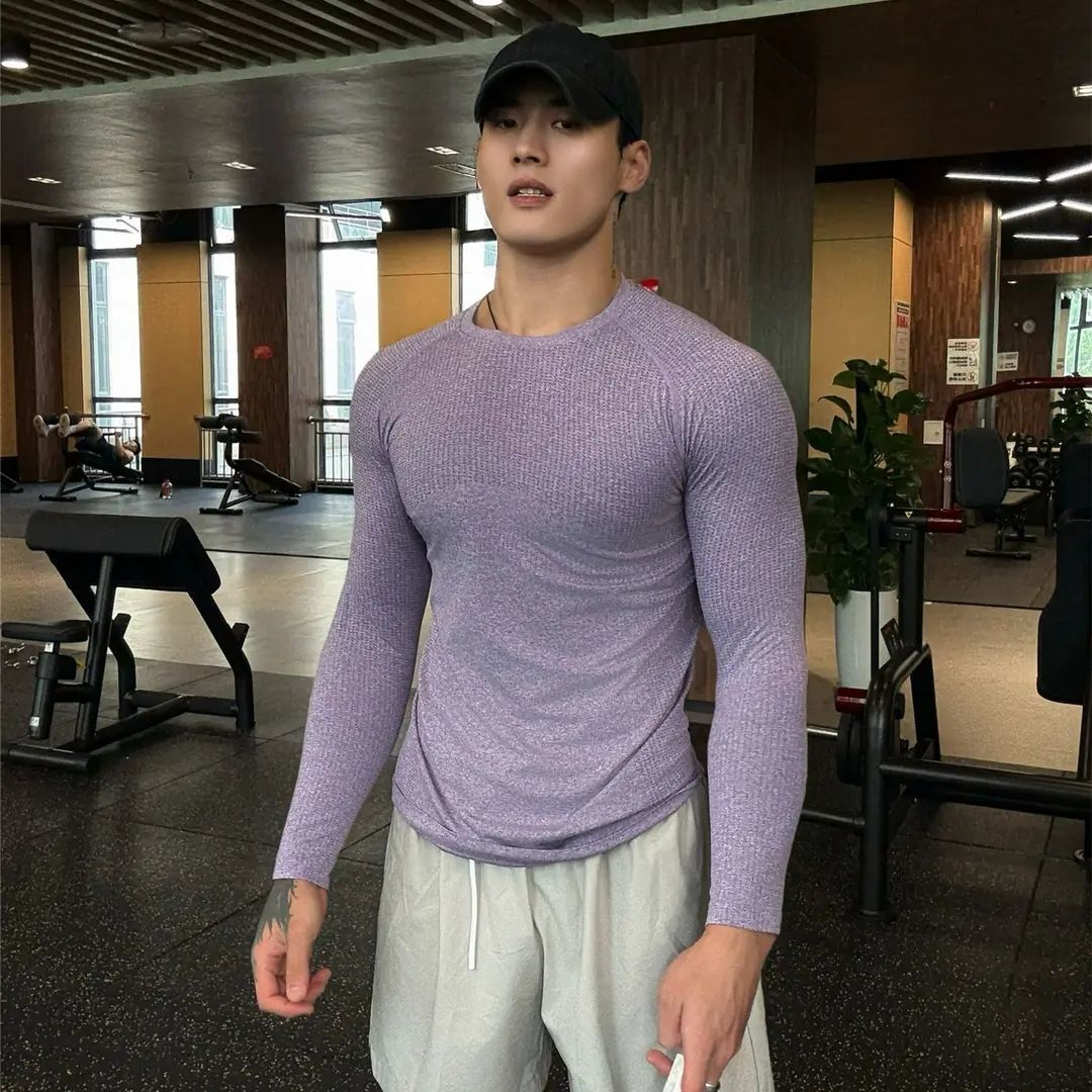 无缝提花运动长袖肌肉男腹肌训练健身服修身弹力速干T恤跑步上衣