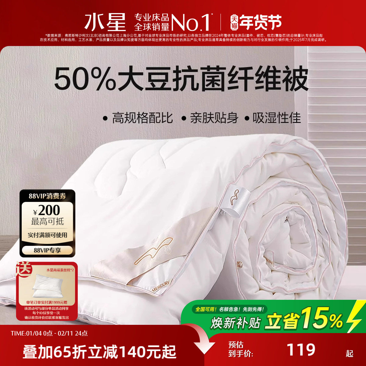 水星家纺全棉被子大豆纤维被加厚冬被二合一子母被春秋被棉年货礼