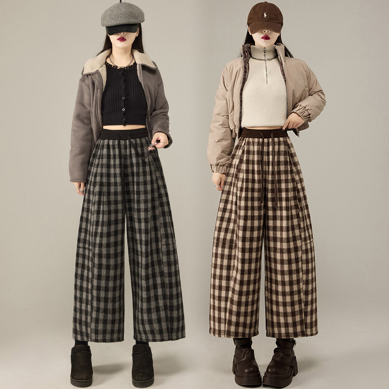 九分格纹奶奶裤加绒阔腿裤女冬季慵懒风宽松显瘦韩版保暖弯刀裤子